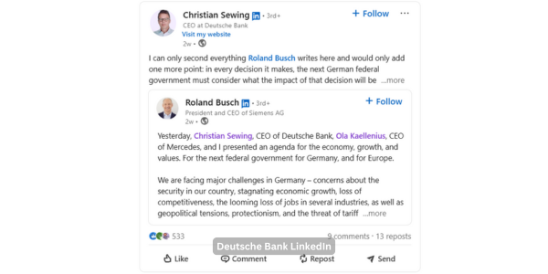 - Leaders from Deutsche Bank, Mercedes, and Siemens have recently voiced their economic policy demands on LinkedIn.