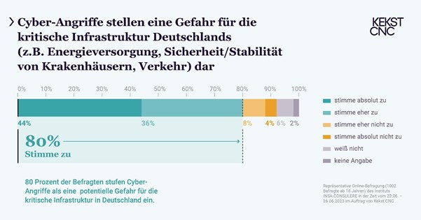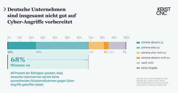 Diese Einschätzung bestätigt auch die neueste repräsentative Umfrage, die Kekst CNC mit dem Meinungsforschungsinstitut INSA-Consulere durchgeführt hat*: Demnach attestieren zwei Drittel der befragten Deutschen (n=1002 Befragte ab 18 Jahren) deutschen Unternehmen beim Schutz vor Cyber-Angriffen noch Nachholpotential: Eine deutliche Mehrheit von 68 Prozent glaubt, dass diese Unternehmen derzeit keine ausreichenden Schutzmaßnahmen getroffen haben.