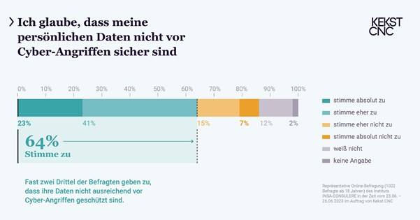 Mit Blick auf die Sicherheit privater Daten sind die Deutschen ebenfalls skeptisch. Knapp zwei Drittel der Befragten (64 Prozent) gehen davon aus, dass ihre Daten nicht sicher sind. Hingegen halten lediglich 22 Prozent ihre persönlichen Daten für ausreichend vor möglichen Cyber-Angriffen geschützt.