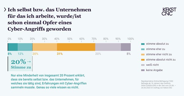 Nur eine Minderheit von insgesamt 20 Prozent der befragten Deutschen erklärt, dass sie bereits selbst beziehungsweise das Unternehmen, für welches sie tätig sind, Erfahrungen mit Cyberangriffen sammeln musste. Das zeigt, dass es in der Regel auf individueller Ebene nur geringe Erfahrungswerte mit Cyber-Attacken gibt.