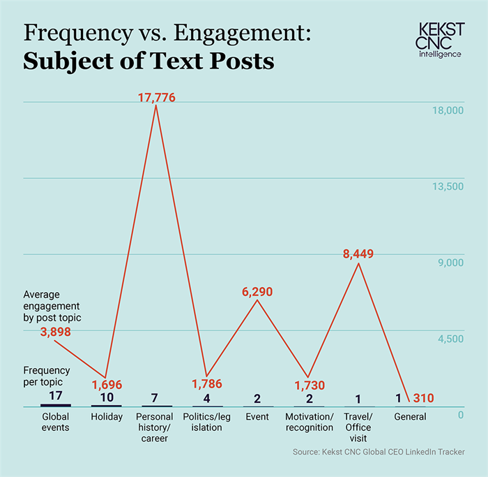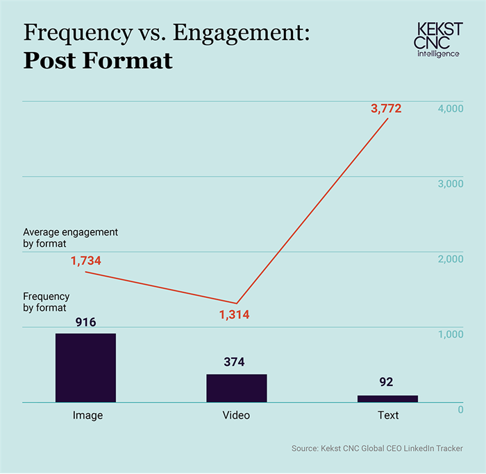 This begs an age-old question: which part of this causal dynamic comes first? Do people actually like simple text posts more, or is it rather that CEOs use the simple text format to post about topics the audience cares most about?