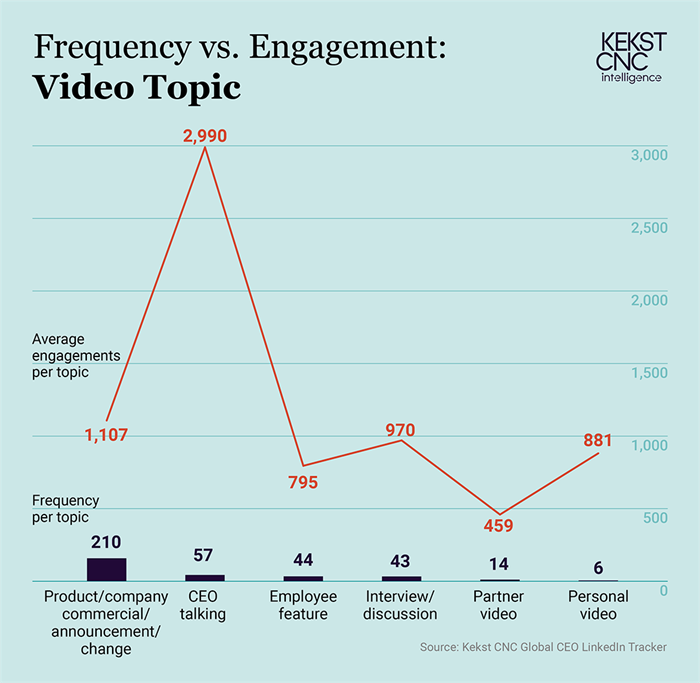 While teams should approach the format with caution, there is one silver lining when it comes to video content, one that doubles as an easy workaround to the problem: while videos of the CEO talking – either directly at the camera or as a recording of an interview, keynote, or panel – account for 27% of all videos, this type of video receives the highest engagement by a large margin.