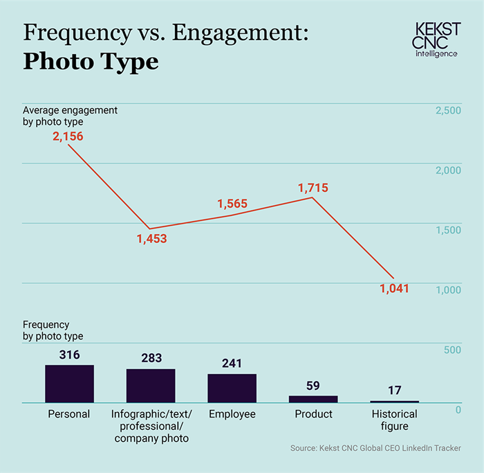 Among posts with images, over 60% of posts either include a photo of the specific CEO or company employees. This is a good approach, as posts that include personal images have the highest average engagement, followed by posts that include images of company products and company employees. This indicates the audience is interested in posts that feature the CEO themselves, which may be due to a sense of perceived authenticity (i.e. the CEO is “posting” an image of themselves).